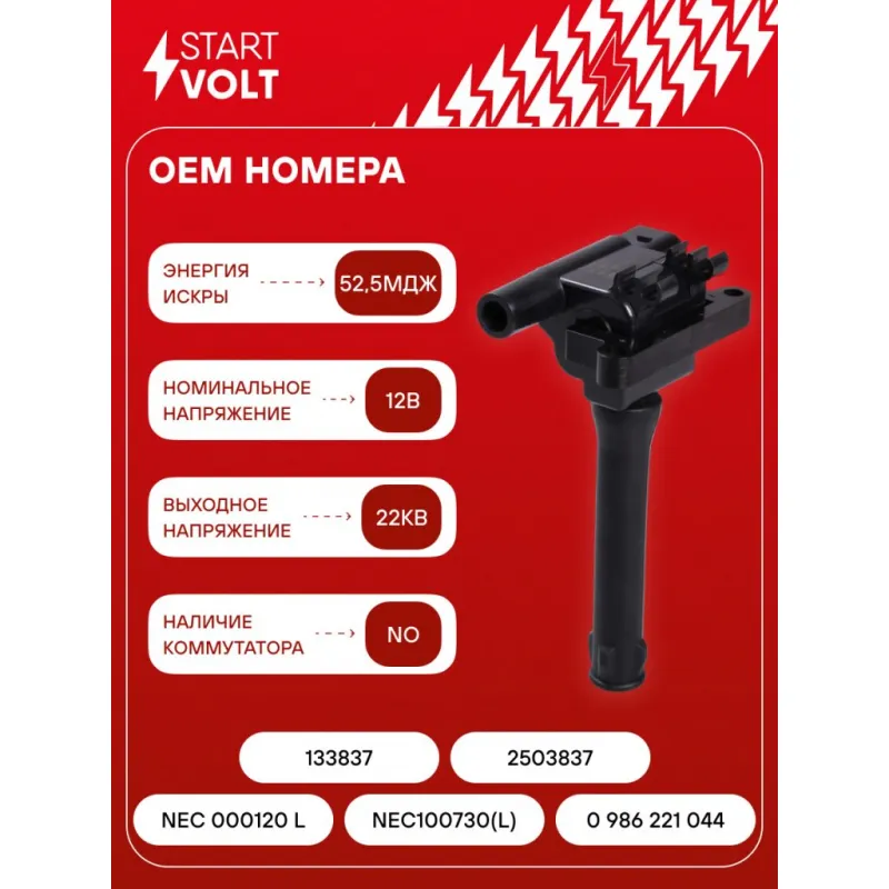 Катушка зажигания для автомобилей Land Rover Freelander (97-) 1.8i Характеристики: Артикул: SC 2641 OEM номера: NEC 000120 L, NEC100730(L), 0 986 221 044, 133837, 2503837 Количество контактов: 2 Выходное напряжение, кВ: 22 Номинальное напряжение, В: 12 Наличие коммутатора: Отсутствует Первичное сопротивление, Ом: 0,75 Вторичное сопротивление, кОм: 24,4 Первичная индуктивность, мН: 4,3 Вторичная индуктивность, Н: 39,5 Энергия искры, мДж: 52,5 Подходит для авто: Land Rover Freelander I (98-) Для проверки применяемости отправьте VIN автомобиля через вкладку "Есть вопросы о товаре?" Комплектация: Катушка зажигания - 1 шт Паспорт изделия/гарантийный талон - 1 шт Гарантия: от 1 года.