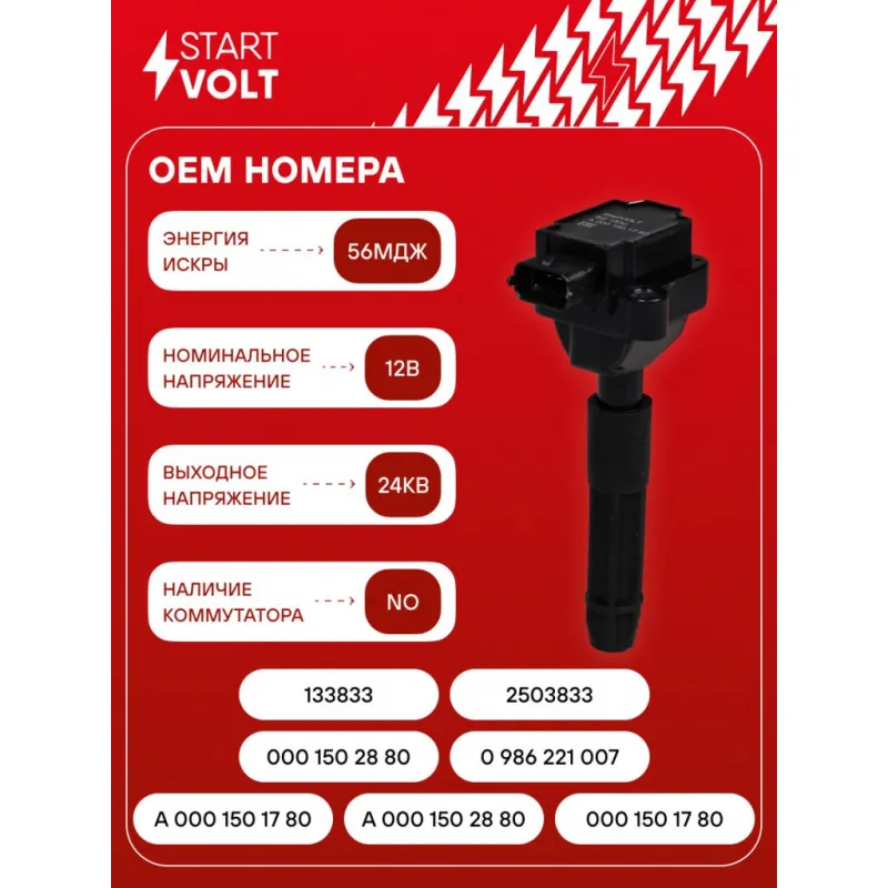 Катушка зажигания для автомобилей Mercedes-Benz C W203 (00-)/E W210 (00-) 2.0T Характеристики: Артикул: SC 1502 OEM номера: A 000 150 17 80, A 000 150 28 80, 000 150 17 80, 000 150 28 80, 0 986 221 007, 133833, 2503833 Количество контактов: 3 Выходное напряжение, кВ: 24 Номинальное напряжение, В: 12 Наличие коммутатора: нет Первичное сопротивление, Ом: 0,47 Первичная индуктивность, мН: 2,3 Энергия искры, мДж: 56 Подходит для авто: Mercedes-Benz C-Class W203 (00-) Для проверки применяемости отправьте VIN автомобиля через вкладку "Есть вопросы о товаре?" Комплектация: Катушка зажигания - 1 шт Паспорт изделия/гарантийный талон - 1 шт Гарантия: от 1 года.