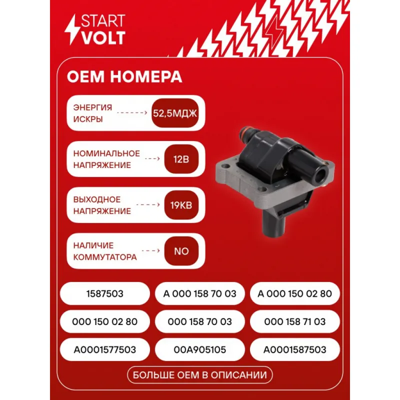 Катушка зажигания для автомобилей Mercedes-Benz C W202 (93-) 1.8i/E W210 (95-) 2.0i/2.3i (без наконечника) Характеристики: Артикул: SC 1517 OEM номера: A0001577503, 00A905105, A0001587503, 000 150 02 80, 000 158 70 03, 000 158 71 03, 0001587503, A 000 158 70 03, A 000 150 02 80, 0001577503, A 000 158 71 03, 1621580103, 133813, 133814, 134022, 2503813, 2503814, 2504022, 0 221506002 Количество контактов: 2 Выходное напряжение, кВ: 19 Номинальное напряжение, В: 12 Наличие коммутатора: Отсутствует Первичное сопротивление, Ом: 0,77 Вторичное сопротивление, кОм: 13 Первичная индуктивность, мН: 2,64 Вторичная индуктивность, Н: 30 Энергия искры, мДж: 52,5 Сопутствующий товар: Наконечники катушек зажигания: STC 1517 Подходит для авто: Mercedes-Benz C-Class W202 (93-), E-Class W210 (95-) SsangYong Rexton (02-) Для проверки применяемости отправьте VIN автомобиля через вкладку "Есть вопросы о товаре?" Комплектация: Паспорт изделия/гарантийный талон - 1 шт Катушка зажигания - 1 шт Гарантия: от 1 года.