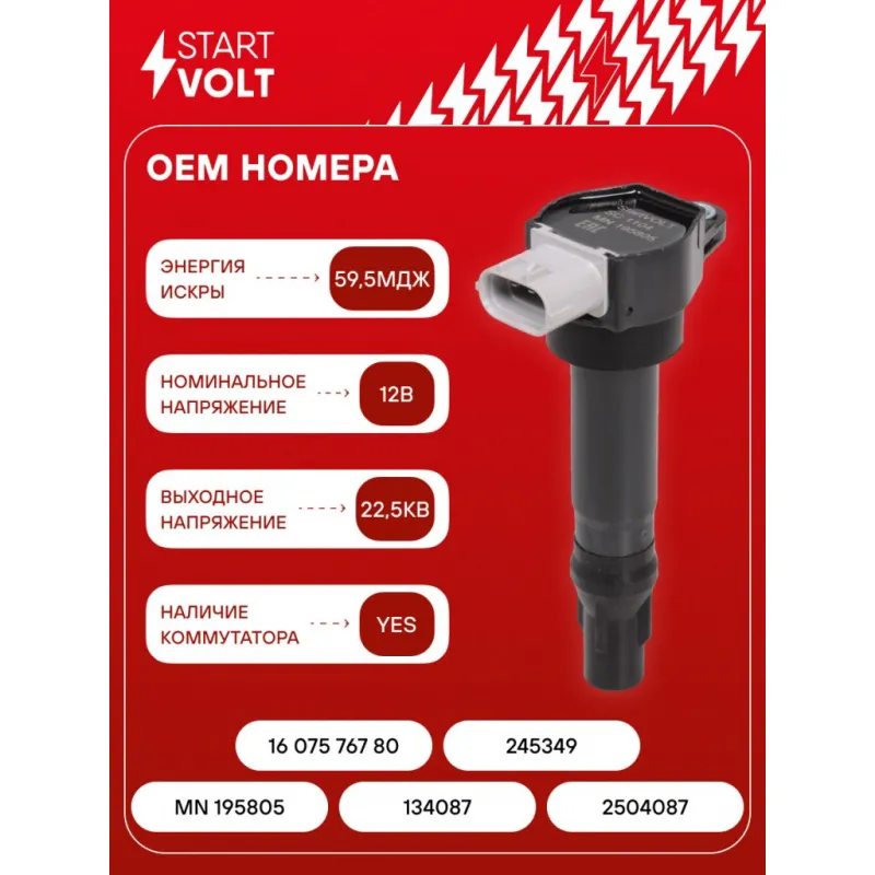 Катушка зажигания для автомобилей Mitsubishi ASX (10-)/Lancer X (08-) 1.6i Характеристики: Артикул: SC 1104 OEM номера: MN 195805, 134087, 2504087, 16 075 767 80, 245349 Количество контактов: 3 Выходное напряжение, кВ: 22,5 Номинальное напряжение, В: 12 Наличие коммутатора: есть Первичное сопротивление, Ом: 0,76 Вторичное сопротивление, кОм: 11,23 Первичная индуктивность, мН: 2,17 Вторичная индуктивность, Н: 18,74 Энергия искры, мДж: 59,5 Сопутствующий товар: Наконечники катушек зажигания: STC 1104 Подходит для авто: Mitsubishi Colt (04-), ASX (10-), Lancer X (07-) Для проверки применяемости отправьте VIN автомобиля через вкладку "Есть вопросы о товаре?" Комплектация: Паспорт изделия/гарантийный талон - 1 шт Катушка зажигания - 1 шт Гарантия: от 1 года.