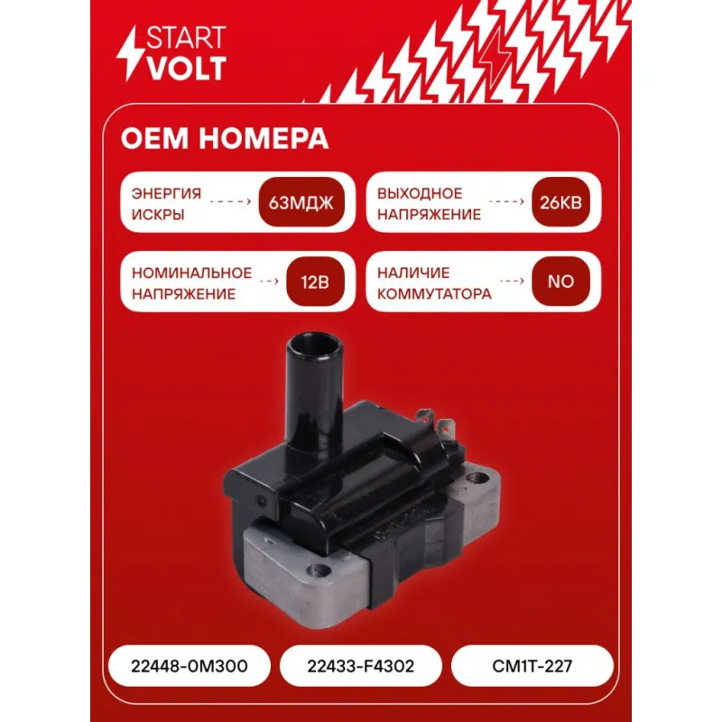 Катушка зажигания для автомобилей Nissan Almera N15 (95-) 1.4i/1.6i Характеристики: Артикул: SC 1493 OEM номера: 22448-0M300, 22433-F4302, CM1T-227 Количество контактов: 2 Выходное напряжение, кВ: 26 Номинальное напряжение, В: 12 Наличие коммутатора: Отсутствует Первичное сопротивление, Ом: 0,69 Вторичное сопротивление, кОм: 17,2 Первичная индуктивность, мН: 3,24 Вторичная индуктивность, Н: 24,8 Энергия искры, мДж: 63 Подходит для авто: Nissan Almera N15 (95-) Для проверки применяемости отправьте VIN автомобиля через вкладку "Есть вопросы о товаре?" Комплектация: Паспорт изделия/гарантийный талон - 1 шт Катушка зажигания - 1 шт Гарантия: от 1 года.