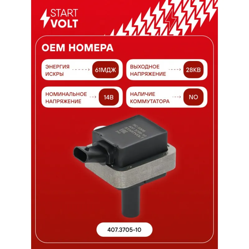 Катушка зажигания для автомобилей ПАЗ с дв.ЗМЗ-5245.10 Евро 4,5 (без наконечника) Характеристики: Артикул: SC 0308 OEM номера: 407.3705-10 Номинальное напряжение, В: 14 Количество контактов: 3 Выходное напряжение, кВ: 28 Наличие коммутатора: нет Первичное сопротивление, Ом: 0,85 Вторичное сопротивление, кОм: - Первичная индуктивность, мН: - Вторичная индуктивность, Н: - Энергия искры, мДж: 61 Сопутствующий товар: Наконечники катушек зажигания: - Комплектация: Паспорт изделия/гарантийный талон - 1 шт Катушка зажигания - 1 шт Гарантия: от 1 года.
