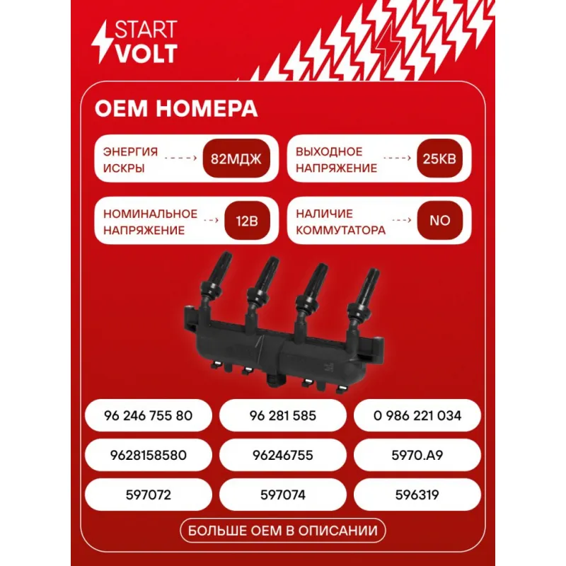 Катушка зажигания для автомобилей Peugeot 206 (98-)/Partner (96-)/Citroen Berlingo (96-) 1.4i Характеристики: Артикул: SC 20206 OEM номера: 597072, 597074, 596319, 9628158580, 96246755, 5970.A9, 96 246 755 80, 96 281 585, 0 986 221 034, 133817, 2503817 Количество контактов: 4 Количество на автомобиль: 1 Выходное напряжение, кВ: 25 Номинальное напряжение, В: 12 Наличие коммутатора: Отсутствует Первичное сопротивление, Ом: 0,49 Вторичное сопротивление, кОм: 3,5 Первичная индуктивность, мН: 1,18 Вторичная индуктивность, Н: 11,38 Энергия искры, мДж: 45 Подходит для авто: Peugeot 206 (98-), 106 (96-), Partner (96-) Citroen Xsara II (00-), Berlingo (00-) Для проверки применяемости отправьте VIN автомобиля через вкладку "Есть вопросы о товаре?" Комплектация: Катушка зажигания - 1 шт Паспорт изделия/гарантийный талон - 1 шт Гарантия: от 1 года.