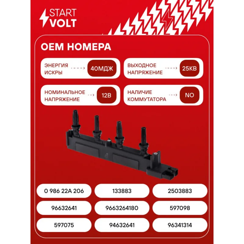 Катушка зажигания для автомобилей Peugeot 406 (99-)/407 (04-)/Citroen C5 (01-) 2.0i Характеристики: Артикул: SC 2020 OEM номера: 597075, 94632641, 96341314, 96632641, 9663264180, 597098, 0 986 22A 206, 133883, 2503883 Количество контактов: 4 Выходное напряжение, кВ: 25 Номинальное напряжение, В: 12 Наличие коммутатора: Отсутствует Энергия искры, мДж: 40 Подходит для авто: Citroen C5 (04-), C4 (04-), Xsara II (00-) Peugeot 407 (04-), 406 (96-), 206 (00-), 307 (00-) Для проверки применяемости отправьте VIN автомобиля через вкладку "Есть вопросы о товаре?" Комплектация: Катушка зажигания - 1 шт Паспорт изделия/гарантийный талон - 1 шт Гарантия: от 1 года.