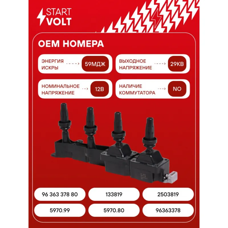 Катушка зажигания для автомобилей Peugeot 307 (00-)/Citroen C4 (04-) 1.6i Характеристики: Артикул: SC 2024 OEM номера: 5970.99, 5970.80, 96363378, 96 363 378 80, 133819, 2503819 Количество контактов: 4 Подходящий разъем AIRLINE:: AECC265 Выходное напряжение, кВ: 29 Номинальное напряжение, В: 12 Наличие коммутатора: Отсутствует Первичное сопротивление, Ом: 0,65 Вторичное сопротивление, кОм: 9,58 Первичная индуктивность, мН: 4,66 Вторичная индуктивность, Н: 26,4 Энергия искры, мДж: 59 Сопутствующий товар: Наконечники катушек зажигания: STC 2024 Подходит для авто: Peugeot 1007 (05-), 307 (00-), 206 (98-) Citroen C2 (03-), C3 (02-), C4 (04-), Xsara II (00-), Berlingo (00-) Для проверки применяемости отправьте VIN автомобиля через вкладку "Есть вопросы о товаре?" Комплектация: Катушка зажигания - 1 шт Паспорт изделия/гарантийный талон - 1 шт Гарантия: от 1 года.