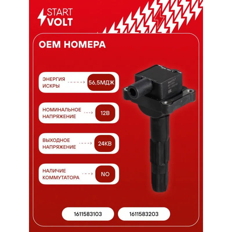 Катушка зажигания для автомобилей SsangYong Kyron (06-)/Rexton (02-) 2.3i Характеристики: Артикул: SC 1701 OEM номера: 1611583103, 1611583203 Количество контактов: 2 Подходящий разъем AIRLINE:: AECC072 Выходное напряжение, кВ: 24 Номинальное напряжение, В: 12 Наличие коммутатора: Отсутствует Первичное сопротивление, Ом: 0,41 Первичная индуктивность, мН: 4 Энергия искры, мДж: 56,5 Подходит для авто: SsangYong Actyon (05-), Kyron (05-) Для проверки применяемости отправьте VIN автомобиля через вкладку "Есть вопросы о товаре?" Комплектация: Паспорт изделия/гарантийный талон - 1 шт Катушка зажигания - 1 шт Гарантия: от 1 года.