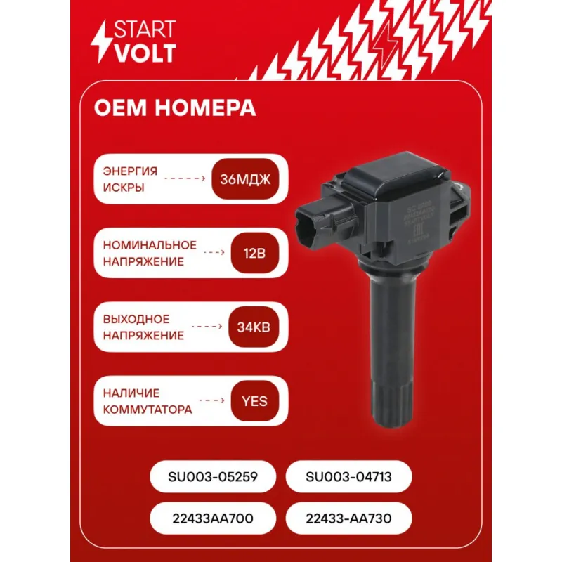 Катушка зажигания для автомобилей Subaru Outback BS (15-) 2.5i/Levorg (15-) 1.6i Характеристики: Артикул: SC 2200 OEM номера: 22433AA700, 22433-AA730, SU003-05259, SU003-04713 Количество контактов: 3 Выходное напряжение, кВ: 34 Наличие коммутатора: + Первичное сопротивление, Ом: - Вторичное сопротивление, кОм: - Первичная индуктивность, мН: - Вторичная индуктивность, Н: - Энергия искры, мДж: 36 Комплектация: Катушка зажигания - 1 шт Паспорт изделия/гарантийный талон - 1 шт Гарантия: от 1 года.