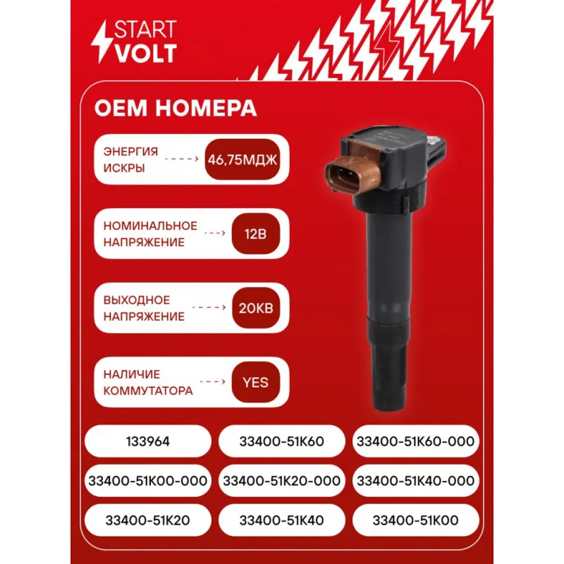 Катушка зажигания для автомобилей Suzuki SX 4 (06-)/Grand Vitara II (09-) 1.6i/2.4i Характеристики: Артикул: SC 2455 OEM номера: 33400-51K20, 33400-51K40, 33400-51K00, 33400-51K00-000, 33400-51K20-000, 33400-51K40-000, 133964, 33400-51K60, 33400-51K60-000 Количество контактов: 3 Подходящий разъем AIRLINE:: AECC091 Выходное напряжение, кВ: 20 Номинальное напряжение, В: 12 Наличие коммутатора: есть Энергия искры, мДж: 46,75 Подходит для авто: Suzuki Swift (11-), SX4 I (06-), Grand Vitara (05-) Для проверки применяемости отправьте VIN автомобиля через вкладку "Есть вопросы о товаре?" Комплектация: Катушка зажигания - 1 шт Паспорт изделия/гарантийный талон - 1 шт Гарантия: от 1 года.