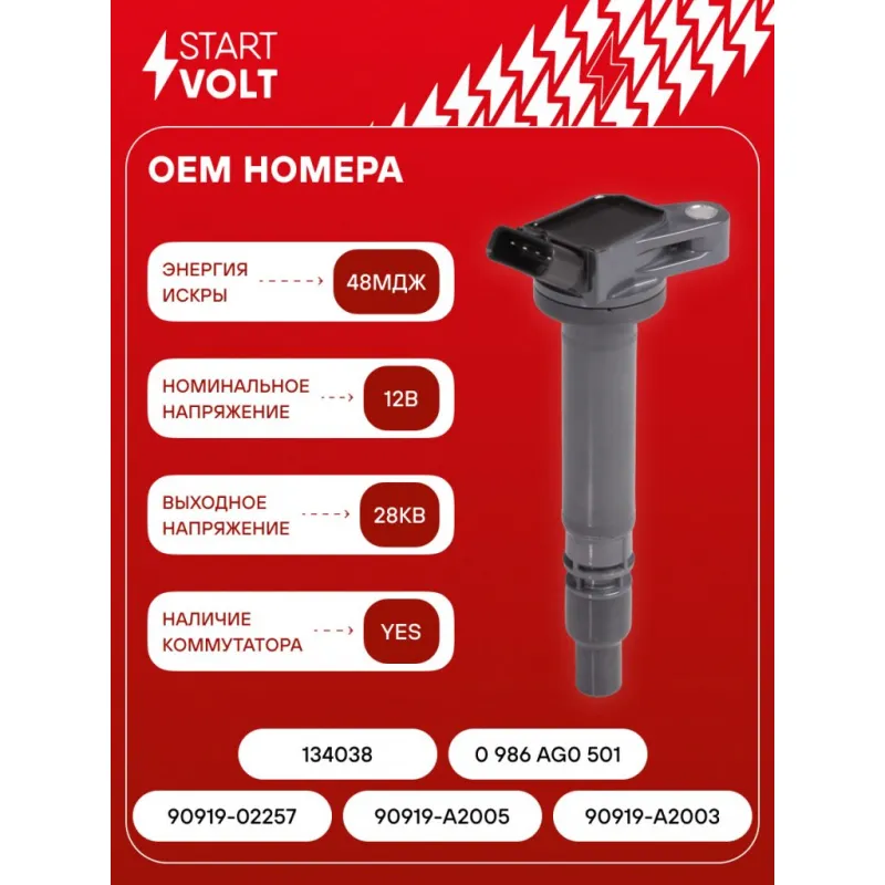 Катушка зажигания для автомобилей Toyota Corolla (07-)/Corolla (13-) 1.3i Характеристики: Артикул: SC 1919 OEM номера: 90919-02257, 90919-A2005, 90919-A2003, 134038, 0 986 AG0 501 Количество контактов: 4 Выходное напряжение, кВ: 28 Номинальное напряжение, В: 12 Наличие коммутатора: Есть Энергия искры, мДж: 48 Подходит для авто: Toyota Corolla E150 (06-), Auris (06-), Auris II (12-), Yaris (05-) Для проверки применяемости отправьте VIN автомобиля через вкладку "Есть вопросы о товаре?" Комплектация: Паспорт изделия/гарантийный талон - 1 шт Катушка зажигания - 1 шт Гарантия: от 1 года.