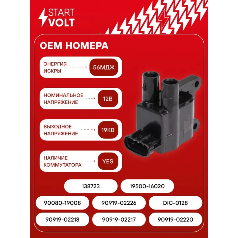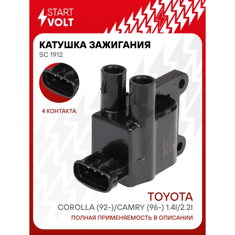Катушка зажигания для автомобилей Toyota Corolla (92-)/Camry (96-) 1.4i/2.2i Характеристики: Артикул: SC 1912 OEM номера: 90919-02218, 90919-02217, 90919-02220, 90080-19008, 90919-02226, DIC-0128, 138723, 19500-16020 Количество контактов: 4 Подходящий разъем AIRLINE:: AECC344, AECC079 Выходное напряжение, кВ: 19 Номинальное напряжение, В: 12 Наличие коммутатора: да Вторичное сопротивление, кОм: 18,76 Вторичная индуктивность, Н: 22,8 Энергия искры, мДж: 56 Подходит для авто: Toyota 4Runner (N180) (95-), Avensis (97-), Camry (96-), Corolla E100 (91-), Corolla E110 (95-) Для проверки применяемости отправьте VIN автомобиля через вкладку "Есть вопросы о товаре?" Комплектация: Катушка зажигания - 1 шт Паспорт изделия/гарантийный талон - 1 шт Гарантия: от 1 года.