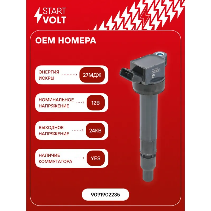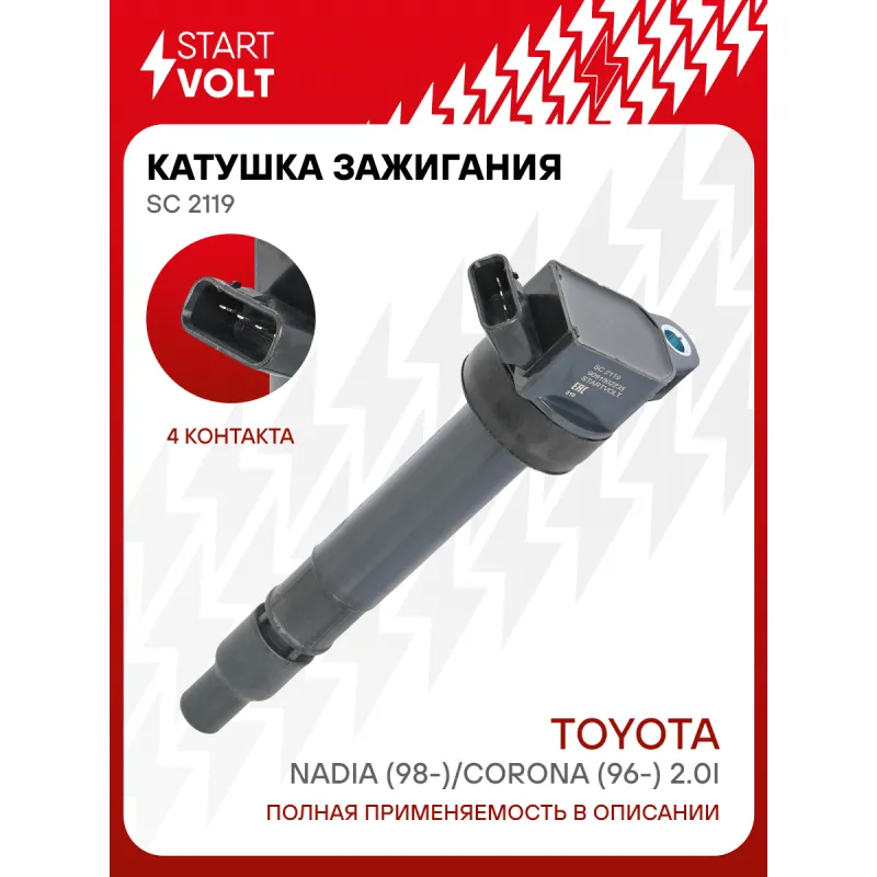 Катушка зажигания для автомобилей Toyota Nadia (98-)/Corona (96-) 2.0i Характеристики: Артикул: SC 2119 OEM номера: 9091902235 Номинальное напряжение, В: 12 Количество контактов: 4 Выходное напряжение, кВ: 24 Наличие коммутатора: Есть Энергия искры, мДж: 27 Подходит для авто: Toyota Corona X T210 (96-), Nadia (98-) Для проверки применяемости отправьте VIN автомобиля через вкладку "Есть вопросы о товаре?" Комплектация: Катушка зажигания - 1 шт Паспорт изделия/гарантийный талон - 1 шт Гарантия: от 1 года.