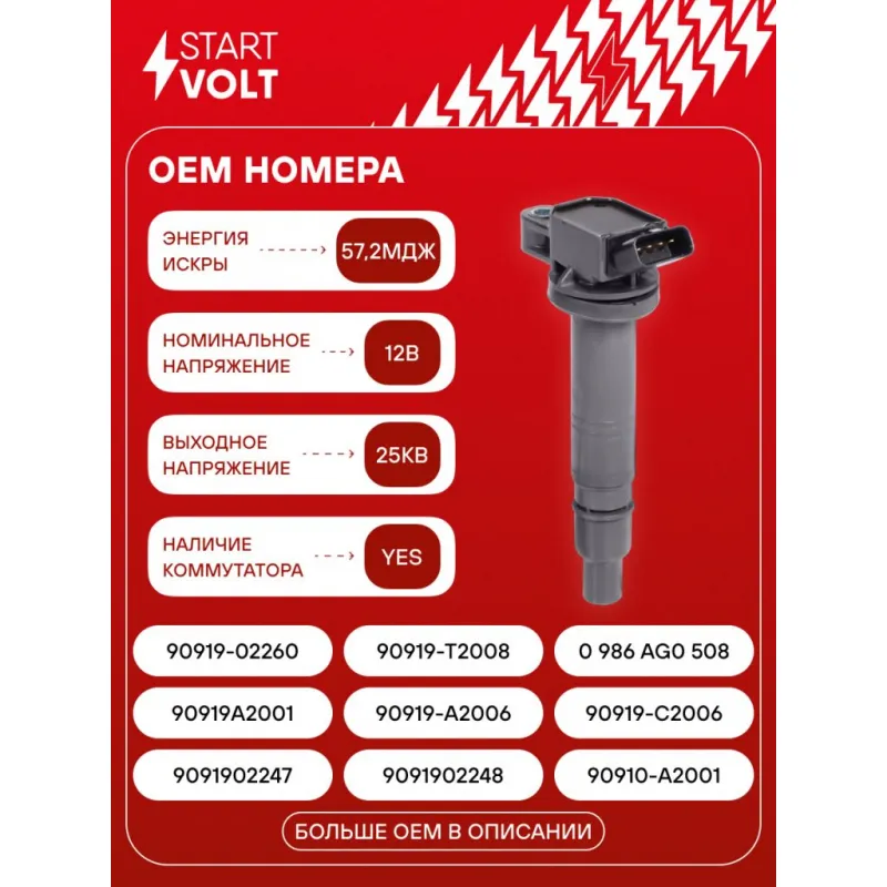 Катушка зажигания для автомобилей Toyota RAV4 (00-)/Avensis (03-)/LC Prado 2.0i/2.4i/2.7i Характеристики: Артикул: SC 1924 OEM номера: 9091902247, 9091902248, 90910-A2001, 90919A2001, 90919-a2006, 90919-C2006, 90919-02260, 90919-T2008, 0 986 AG0 508, DIC-0134, 133874 Количество контактов: 4 Подходящий разъем AIRLINE:: AECC344, AECC079 Выходное напряжение, кВ: 25 Номинальное напряжение, В: 12 Наличие коммутатора: Есть Энергия искры, мДж: 57,2 Подходит для авто: Toyota Land Cruiser Prado 120 (02-), Avensis (97-), RAV 4 (00-), Camry (01-) Для проверки применяемости отправьте VIN автомобиля через вкладку "Есть вопросы о товаре?" Комплектация: Катушка зажигания - 1 шт Паспорт изделия/гарантийный талон - 1 шт Гарантия: от 1 года.
