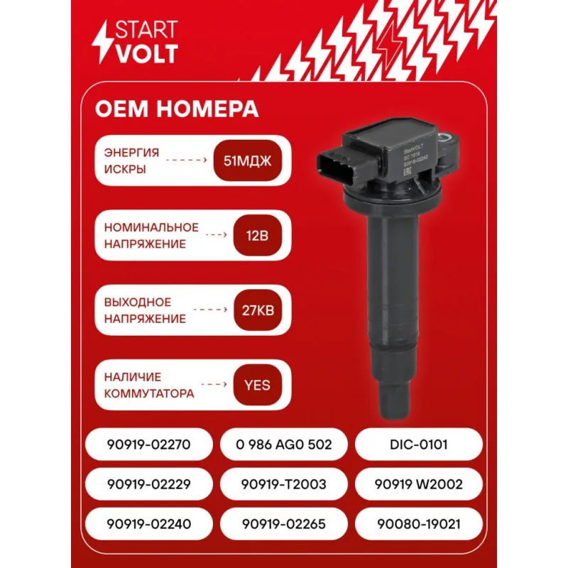 Катушка зажигания для автомобилей Toyota Vitz (00-)/Corolla (13-) 1.0i/1.5i Характеристики: Артикул: SC 1916 OEM номера: 90919-02240, 90919-02265, 90080-19021, 90919-02229, 90919-T2003, 90919 W2002, 90919-02270, 0 986 AG0 502, DIC-0101 Количество контактов: 4 Подходящий разъем AIRLINE:: AECC344, AECC079 Выходное напряжение, кВ: 27 Номинальное напряжение, В: 12 Наличие коммутатора: есть Энергия искры, мДж: 51 Сопутствующий товар: Наконечники катушек зажигания: STC 1916 Комплектация: Катушка зажигания - 1 шт Паспорт изделия/гарантийный талон - 1 шт Гарантия: от 1 года.