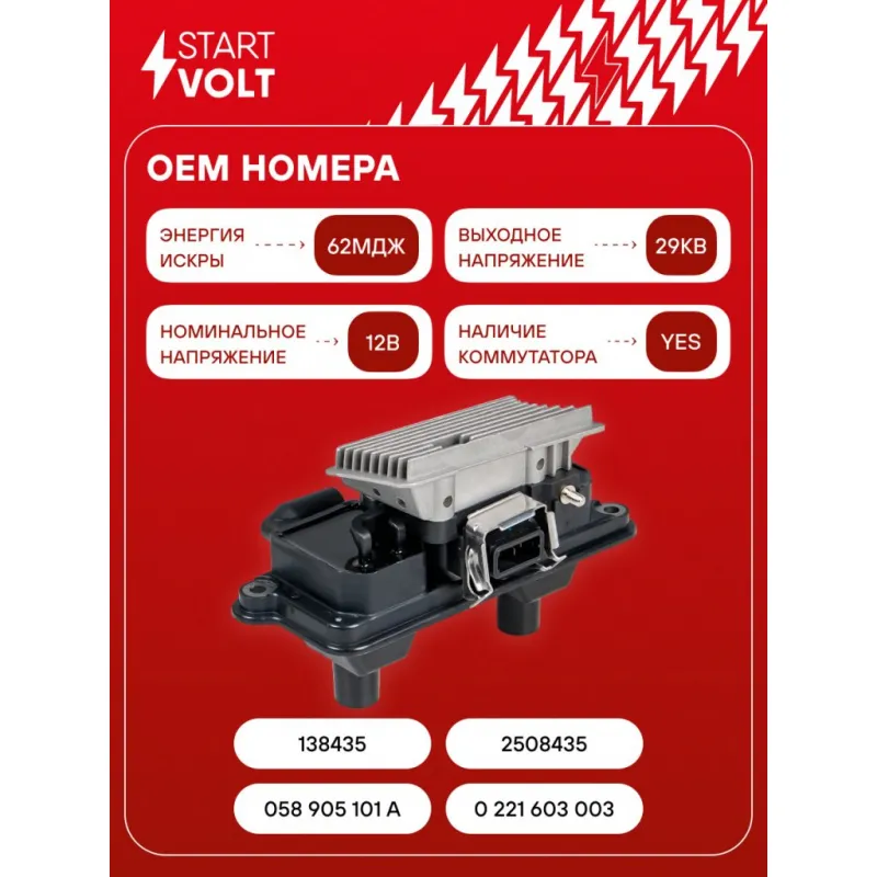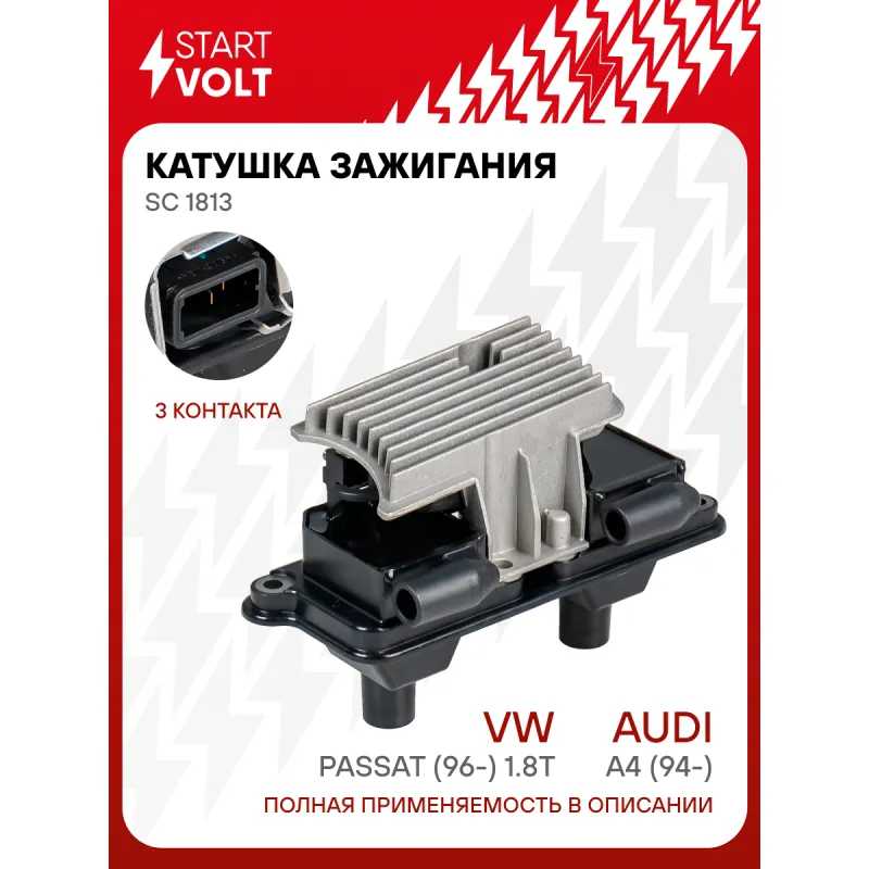 Катушка зажигания для автомобилей VAG A4 (94-)/Passat (96-) 1.8T Характеристики: Артикул: SC 1813 OEM номера: 058 905 101 A, 0 221 603 003, 138435, 2508435 Номинальное напряжение, В: 12 Количество контактов: 3 Выходное напряжение, кВ: 29 Наличие коммутатора: Есть Энергия искры, мДж: 62 Подходит для авто: Audi A4 (97-) Volkswa... Читать полностью →