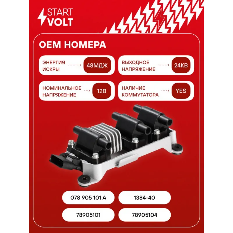 Катушка зажигания для автомобилей VAG A6 (94-)/100 (90-) 2.6i/2.8i Характеристики: Артикул: SC 1851 OEM номера: 078 905 101, 078 905 104, 078 905 101 A, 1384-40 Количество контактов: 5 Выходное напряжение, кВ: 24 Номинальное напряжение, В: 12 Наличие коммутатора: есть Вторичное сопротивление, кОм: 11,9 Вторичная индуктивность, Н: 22,4 Энергия искры, мДж: 48 Подходит для авто: Audi 100 (90-), 80 (91-), A6 C4 (94-) Для проверки применяемости отправьте VIN автомобиля через вкладку "Есть вопросы о товаре?" Комплектация: Катушка зажигания - 1 шт Паспорт изделия/гарантийный талон - 1 шт Гарантия: от 1 года.