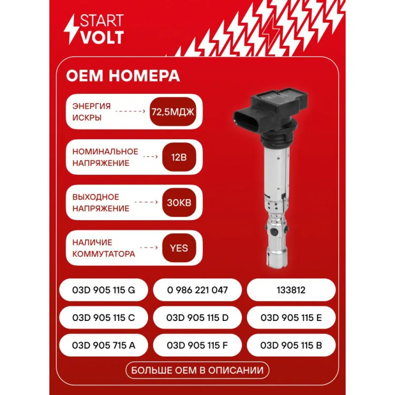 Катушка зажигания для автомобилей VAG Fabia I (01-)/Fabia II (06-) 1.2i Характеристики: Артикул: SC 1812 OEM номера: 03D 905 715 A, 03D 905 115 F, 03D 905 115 B, 03D 905 115 C, 03D 905 115 D, 03D 905 115 E, 03D 905 115 G, 0 986 221 047, 133812, 2503812 Количество контактов: 4 Выходное напряжение, кВ: 30 Номинальное напряжение, В: 12 Наличие коммутатора: Есть Первичное сопротивление, Ом: 0,77 Вторичное сопротивление, кОм: 13 Первичная индуктивность, мН: 2,64 Вторичная индуктивность, Н: 30 Энергия искры, мДж: 72,5 Подходит для авто: Volkswagen Polo IV (01-) Skoda Fabia II (07-) Для проверки применяемости отправьте VIN автомобиля через вкладку "Есть вопросы о товаре?" Комплектация: Катушка зажигания - 1 шт Паспорт изделия/гарантийный талон - 1 шт Гарантия: от 1 года.