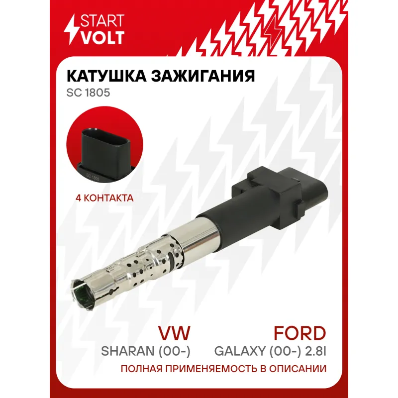 Катушка зажигания для автомобилей VAG Sharan (00-)/Ford Galaxy (00-) 2.8i Характеристики: Артикул: SC 1805 OEM номера: 1120169, 1252407, 1331283, 1362718, 1673468, 6M21-12029-AA, 022905100G, 022905100K, 022905100N, 022905715C, YM21-12029-AA, YM21-12029-AB, YM21-12029-AC, YM21-12029-AD, 022905100A, 022905100D Номинальное напряжение, В: 14 Количество контактов: 4 Выходное напряжение, кВ: 28 Наличие коммутатора: да Первичное сопротивление, Ом: - Вторичное сопротивление, кОм: - Первичная индуктивность, мН: - Вторичная индуктивность, Н: - Энергия искры, мДж: 50 Сопутствующий товар: Наконечники катушек зажигания: - Комплектация: Катушка зажигания - 1 шт Паспорт изделия/гарантийный талон - 1 шт Гарантия: от 1 года.