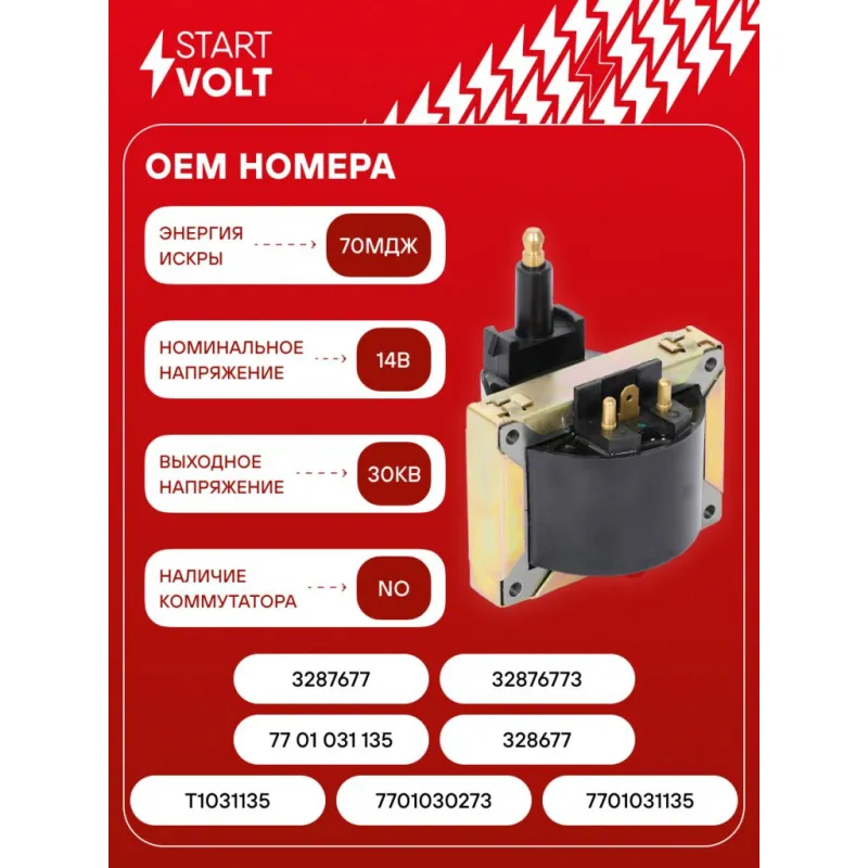 Катушка зажигания для автомобилей Volvo 460 (91-) 1.7i/1.8i/Renault Laguna I (93-) 1.8i/2.0i Характеристики: Артикул: SC 0900 OEM номера: T1031135, 7701030273, 77 01 031 135, 328677, 3287677, 32876773 Номинальное напряжение, В: 14 Количество контактов: 3 Выходное напряжение, кВ: 30 Наличие коммутатора: нет Первичное сопротивление, Ом: - Вторичное сопротивление, кОм: - Первичная индуктивность, мН: - Вторичная индуктивность, Н: - Энергия искры, мДж: 70 Сопутствующий товар: Наконечники катушек зажигания: - Комплектация: Катушка зажигания - 1 шт Паспорт изделия/гарантийный талон - 1 шт Гарантия: от 1 года.