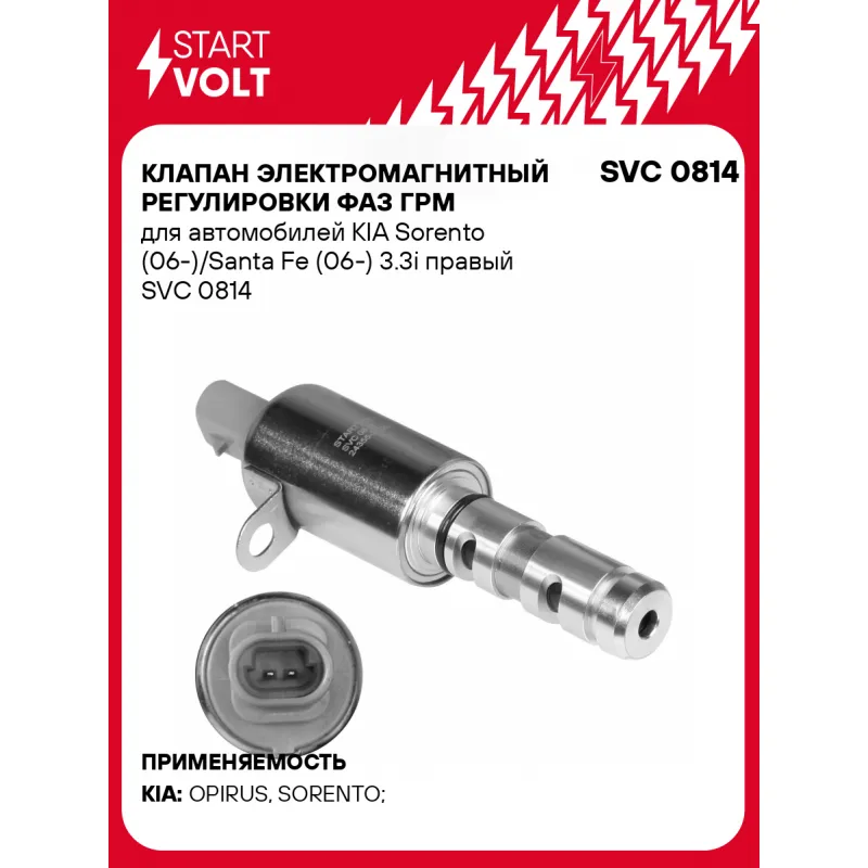 Клапан электромагнитный регулировки фаз ГРМ для автомобилей KIA Sorento (06-)/Santa Fe (06-) 3.3i правый Характеристики: Артикул: SVC 0814 OEM номера: 24355-3C200 Количество на автомобиль: 1 Номинальное напряжение, В: 12 Сопротивление изоляции обмотки клапана, Ом: 7 Комплектация: Паспорт изделия/гарантийный талон Клапан электромагнитный регулировки фаз ГРМ - 1 шт Гарантия: от 1 года.