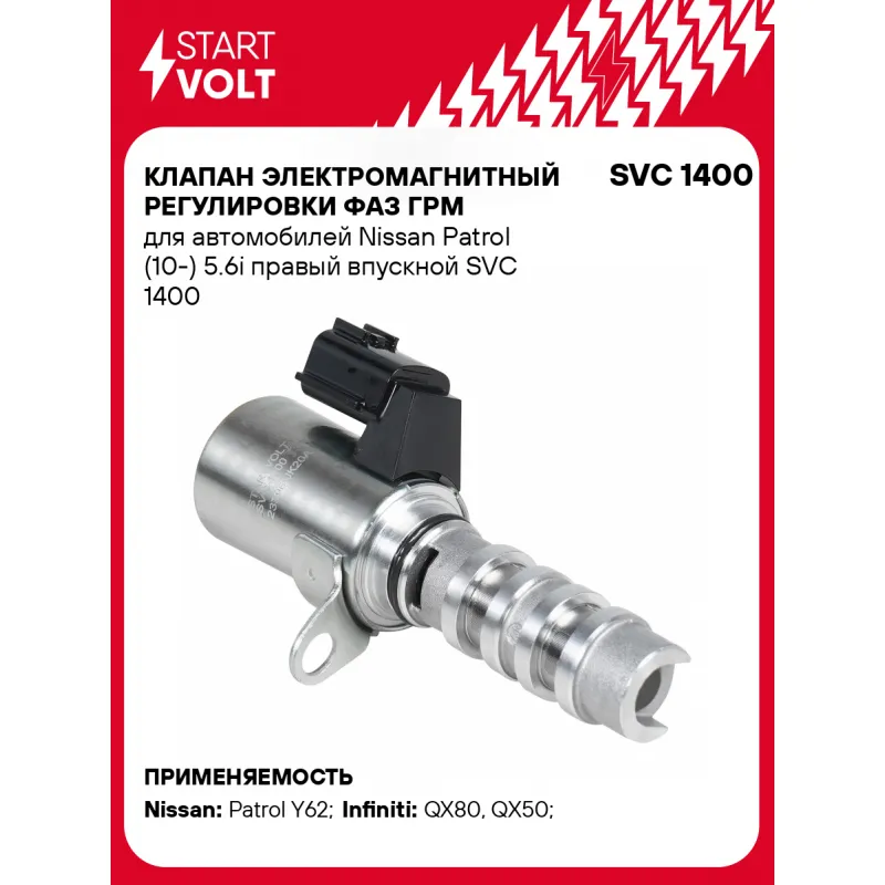 Клапан электромагнитный регулировки фаз ГРМ для автомобилей Nissan Patrol (10-) 5.6i правый впускной Характеристики: Артикул: SVC 1400 OEM номера: 23796-JK24B, 23796-JK20A, 23796-JK20B, 23796-JK22B Номинальное напряжение, В: 12 Сопротивление изоляции обмотки клапана, Ом: 7,3 Количество на автомобиль: 1 Сопротивление изоляции, Ом: 7 Подходит для авто: Nissan Patrol Y62 (10-) Infiniti QX80 (13-), QX50 (13-) Для проверки применяемости отправьте VIN автомобиля через вкладку "Есть вопросы о товаре?" Комплектация: Клапан электромагнитный регулировки фаз ГРМ Паспорт изделия/гарантийный талон Гарантия: от 1 года.
