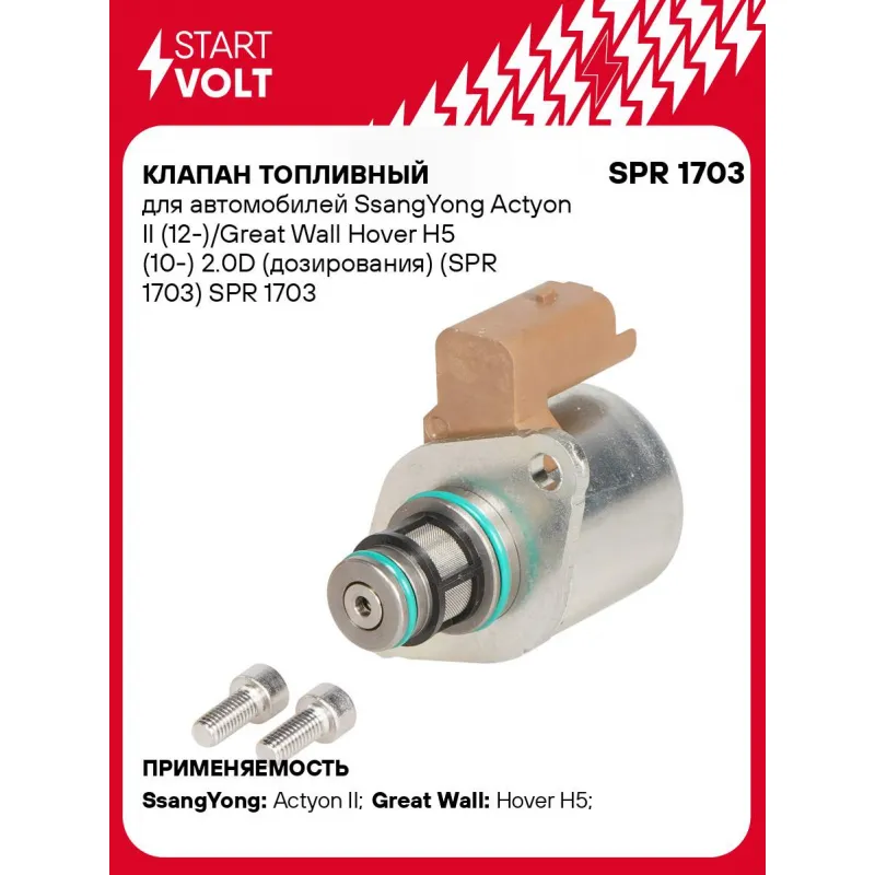 Клапан топливный для автомобилей SsangYong Actyon II (12-)/Great Wall Hover H5 (10-) 2.0D (дозирования) (SPR 1703) Характеристики: Артикул: SPR 1703 OEM номера: 6710750001, 7701479182, 1933.45, 9M5Q9D347AA, 1736080, 9467636180, F680012103001, 9109936A Номинальное напряжение, В: 12 Сопротивление, Ом: 5,5 Максимальный ток, А: 2 Частота, Гц: 165-195 Количество на автомобиль: 1 Подходит для авто: SsangYong Actyon II (10-) Great Wall Hover H5 (11-) Для проверки применяемости отправьте VIN автомобиля через вкладку "Есть вопросы о товаре?" Комплектация: Паспорт изделия/гарантийный талон - 1 шт Клапан - 1 шт Болты крепежные - 2 шт Гарантия: от 1 года.