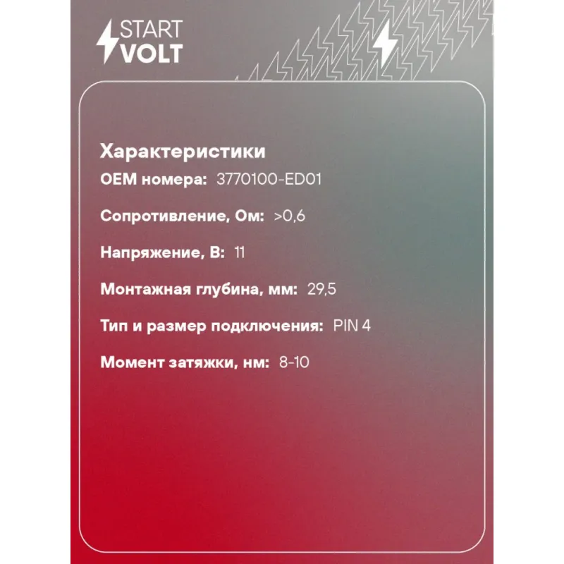 Комплект свечей накаливания (4шт) для автомобилей Great Wall Hover H5 (10-) 2.0D Характеристики: Артикул: GLSP 516 OEM номера: 3770100-ED01 Сопротивление, Ом: >0,6 Резьба: М8х1 Напряжение, В: 11 Монтажная глубина, мм: 29,5 Покатность конуса, град: 93 Тип и размер подключения: PIN 4 Момент затяжки, нм: 8-10 Ширина ключа: 8 Общая длина, мм: 146 Количество на автомобиль: 1 Комплектация: Паспорт изделия/гарантийный талон - 1 шт Гайка - 4 шт Свеча накаливания - 4 шт Гарантия: от 1 года.