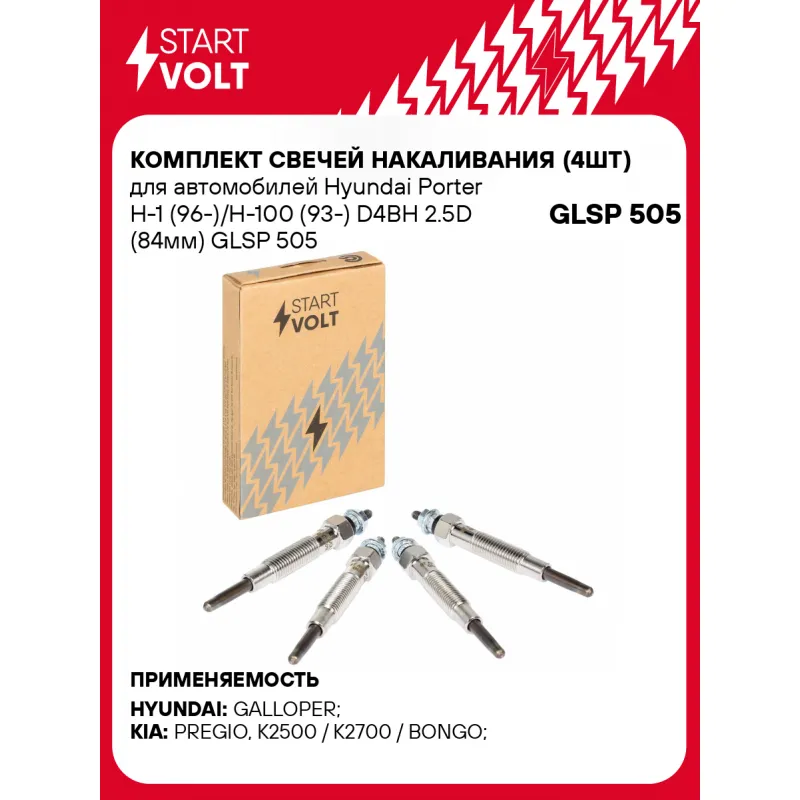 Комплект свечей накаливания (4шт) для автомобилей Hyundai Porter H-1 (96-)/H-100 (93-) D4BH 2.5D (84мм) Характеристики: Артикул: GLSP 505 OEM номера: 36710-42000, 36710-42020, 36710-42060 Сопротивление, Ом: >0,6 Резьба: M10x1,25 Напряжение, В: 11 Монтажная глубина, мм: 22 Покатность конуса, град: 119 Тип и размер подключения: M4 Момент затяжки, нм: 10-12 Ширина ключа: 12 Общая длина, мм: 84 Количество на автомобиль: 1 Комплектация: Паспорт изделия/гарантийный талон - 1 шт Гайка - 4 шт Свеча накаливания - 4 шт Гарантия: от 1 года.