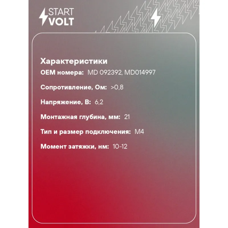 Комплект свечей накаливания (4шт) для автомобилей Mitsubishi Delica (86-) 2.5D Характеристики: Артикул: GLSP 518 OEM номера: MD 092392, MD014997 Сопротивление, Ом: >0,8 Резьба: М10х1,25 Напряжение, В: 6,2 Монтажная глубина, мм: 21 Покатность конуса, град: 119 Тип и размер подключения: М4 Момент затяжки, нм: 10-12 Ширина ключа: 12 Общая длина, мм: 95 Количество на автомобиль: 1 Комплектация: Паспорт изделия/гарантийный талон - 1 шт Гайка - 4 шт Свеча накаливания - 4 шт Гарантия: от 1 года.
