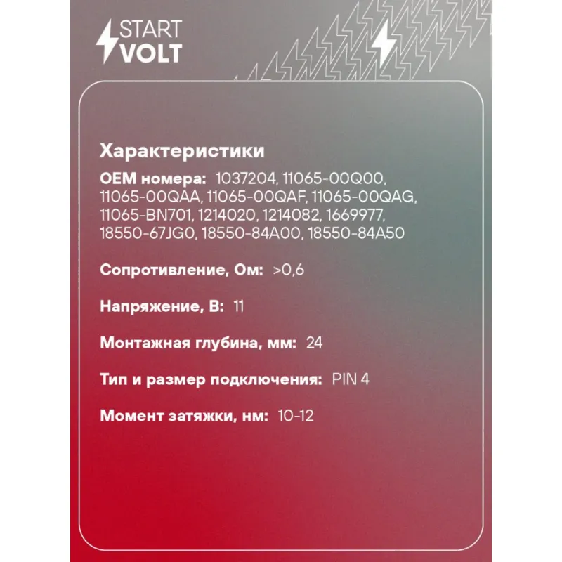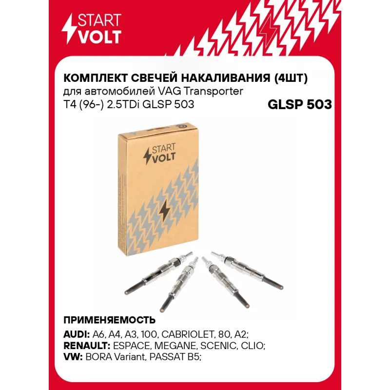 Комплект свечей накаливания (4шт) для автомобилей VAG Transporter T4 (96-) 2.5TDi Характеристики: Артикул: GLSP 503 OEM номера: 1037204, 11065-00Q00, 11065-00QAA, 11065-00QAF, 11065-00QAG, 11065-BN701, 1214020, 1214082, 1669977, 18550-67JG0, 18550-84A00, 18550-84A50, 18550-84A51, 30883828, 4402724, 4416912, 7700111323, 7701069730, 8200421091, 8200434855, 8200464077, 8200490950, 8671004853, 88900722, 9110724, 93189648, 93196922, M883828, MW30756065, N10140101, N10140102, N10140103, N10140104, N10140105 Сопротивление, Ом: >0,6 Резьба: M10X1 Напряжение, В: 11 Монтажная глубина, мм: 24 Покатность конуса, град: 63 Тип и размер подключения: PIN 4 Момент затяжки, нм: 10-12 Ширина ключа: 10 Общая длина, мм: 91,2 Количество на автомобиль: 1 Комплектация: Паспорт изделия/гарантийный талон - 1 шт Гайка - 4 шт Свеча накаливания - 4 шт Гарантия: от 1 года.