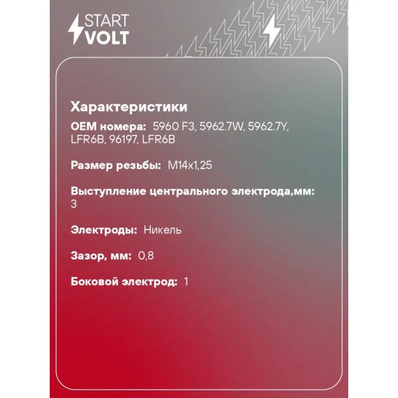 Комплект свечей зажигания для автомобилей Citroen C4 (04-)/Peugeot 307 (00-) 1.6i/2.0i (4шт) Характеристики: Артикул: VSP 0047 OEM номера: 5960 F3, 5962.7W, 5962.7Y, LFR6B, 96197 Резистор: Есть Момент затяжки, нм: 25-30 Количество на автомобиль: 1 Ширина ключа,мм: 16 Размер резьбы: M14x1,25 Длина резьбы,мм: 26,5 Выступление центрального электрода,мм: 3 Боковой электрод: 1 Электроды: Никель Зазор, мм: 0,8 Маркировка: NKHP6R Комплектация: Паспорт изделия/гарантийный талон Свеча зажигания - 4 шт Гарантия: от 1 года.