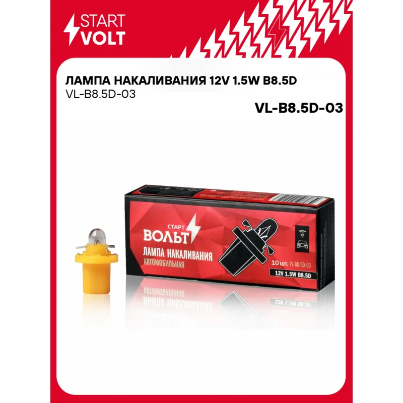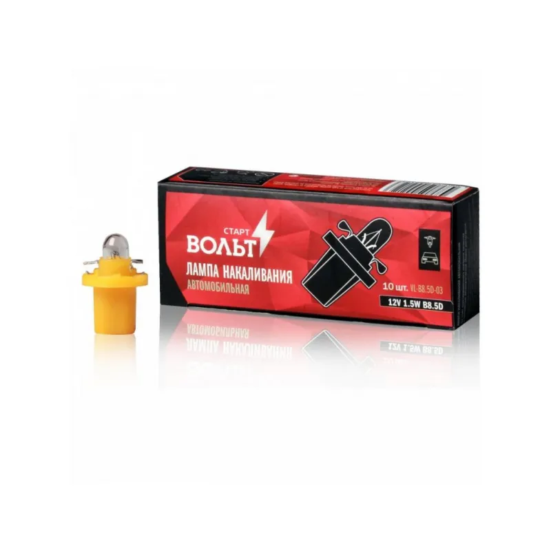 Лампа накаливания 12V 1.5W B8.5D Характеристики: Артикул: VL-B8.5D-03 OEM номера: VL-B8.5D-03 Количество на автомобиль: 2 Номинальное напряжение, В: 12 Комплектация: Лампа Гарантия: от 1 года.