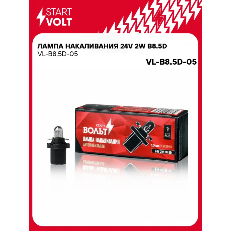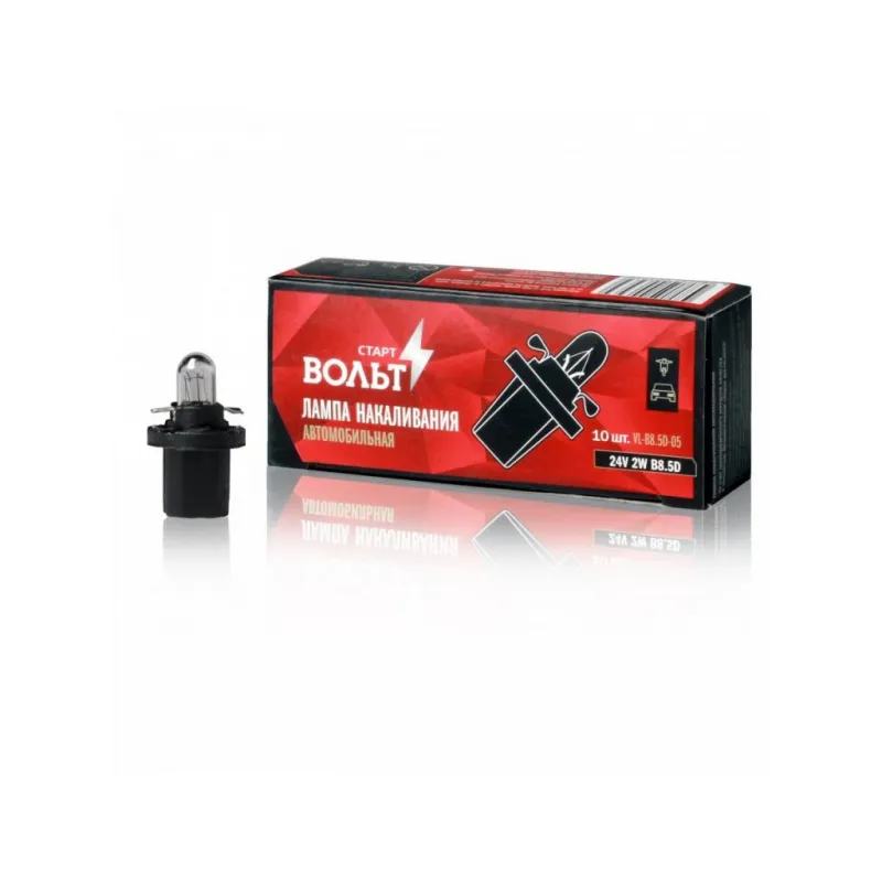 Лампа накаливания 24V 2W B8.5D Характеристики: Артикул: VL-B8.5D-05 OEM номера: VL-B8.5D-05 Количество на автомобиль: 2 Номинальное напряжение, В: 24 Комплектация: Лампа Гарантия: от 1 года.