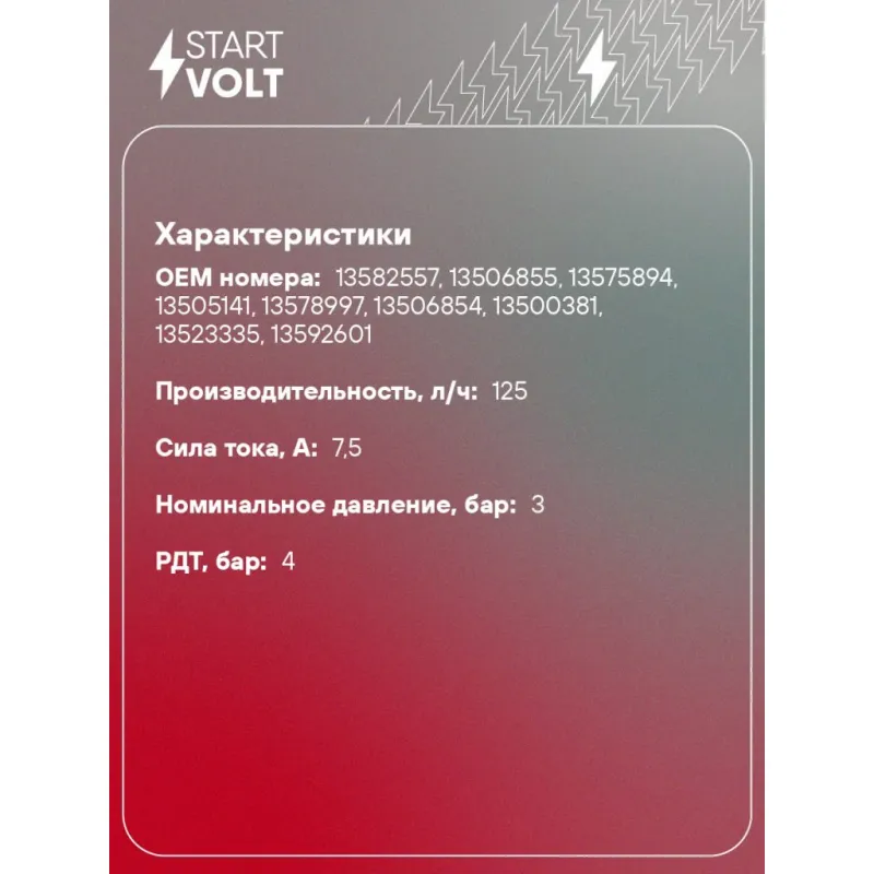 Модуль топливного насоса для автомобилей Chevrolet Spark M300 (09-) 1.0i/1.2i Характеристики: Артикул: SFM 0514 OEM номера: 13582557, 13506855, 13575894, 13505141, 13578997, 13506854, 13500381, 13523335, 13592601 Производительность, л/ч: 125 Сила тока, А: 7,5 Номинальное давление, бар: 3 РДТ, бар: 4 Количество на автомобиль: 1 Подходит для авто: Chevrolet Spark (09-) Для проверки применяемости отправьте VIN автомобиля через вкладку "Есть вопросы о товаре?" Комплектация: Паспорт изделия/гарантийный талон - 1 шт Модуль топливного насоса - 1 шт Штанга датчика уровня топлива - 1 шт Гарантия: от 1 года.