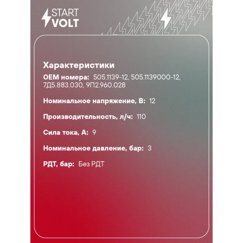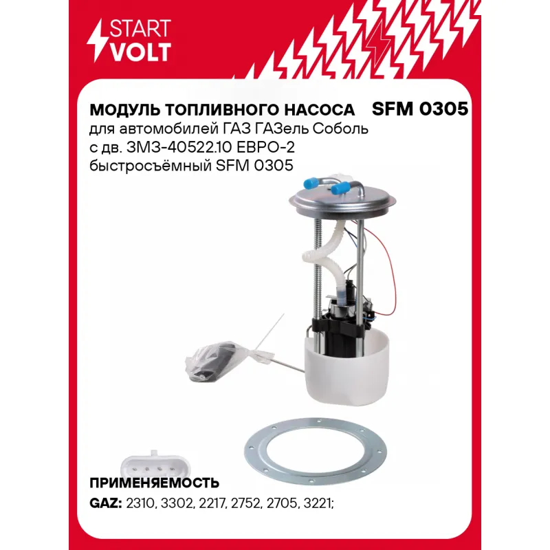 Модуль топливного насоса для автомобилей ГАЗ ГАЗель Соболь с дв. ЗМЗ-40522.10 ЕВРО-2 быстросъёмный Описание: Модуль топливозаборника SFM 0305 бренда STARTVOLT, 12 В – устройство погружного типа с датчиком указателя уровня топлива и встроенным обратным клапаном. Предназначен для обеспечения забора топлива из бензобака в системе питания двигателя автомобиля, а также обеспечения контроля уровня топлива в баке. Производительность - 110 л/ч. Обратный клапан применяется для предотвращения слива топлива обратно в бак из подающей магистрали во время выключенного двигателя. Что уменьшает затраты механического насоса на заполнение магистрали топливом и обеспечивает уверенный запуск двигателя. Применяется на автомобилях, имеющих двигатели карбюраторного и дизельного типа. Сопутствующий товар: Моторы бензонасоса (топливные насосы электрические) SFP 0135. Применяемость модуля топливного насоса для автомобилей: GAZ SOBOL, GAZELLE, VOLGA.. Подбор по VIN-номеру вашего автомобиля - через кнопку 'Задать вопрос'. Специалист проверит применяемость и ответит вам. Модуль топливозаборника погружного типа состоит из:металлическая или пластиковая крышки со штуцерами, пластиковая топливозаборная часть, фильтр грубой очистки, пластиковые гофрированные шланги, датчик уровня поплавкового типа, провода с электрическим разъемом. Характеристики: Артикул: SFM 0305 OEM номера: 505.1139-12, 505.1139000-12, 7Д5.883.030, 9П2.960.028 Номинальное напряжение, В: 12 Производительность, л/ч: 110 Сила тока, А: 9 Номинальное давление, бар: 3 Сопутствующий товар: Моторы бензонасоса (топливные насосы электрические): SFP 0135 РДТ, бар: без РДТ Количество на автомобиль: 1 Подходит для авто: ГАЗ 2310, 3302, 2217, 2752, 2705, 3221 Для проверки применяемости отправьте VIN автомобиля через вкладку "Есть вопросы о товаре?" Комплектация: Паспорт изделия/гарантийный талон - 1 шт Кольцо установочное металлическое - 1 шт Болт - 8 шт Шайба - 8 шт Модуль топливного насоса - 1 шт Штанга датчика уровня топлива - 1 шт Гарантия: от 1 года.
