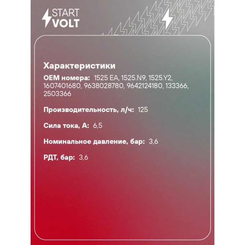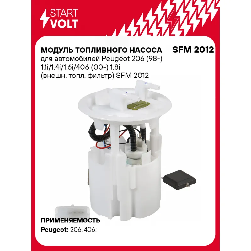 Модуль топливного насоса для автомобилей Peugeot 206 (98-) 1.1i/1.4i/1.6i/406 (00-) 1.8i (внешн. топл. фильтр) Характеристики: Артикул: SFM 2012 OEM номера: 1525 EA, 1525.N9, 1525.Y2, 1607401680, 9638028780, 9642124180, 133366, 2503366 Производительность, л/ч: 125 Сила тока, А: 6,5 Номинальное давление, бар: 3,6 РДТ, бар: 3,6 Количество на автомобиль: 1 Подходит для авто: Peugeot 206 (98-), 406 (96-) Для проверки применяемости отправьте VIN автомобиля через вкладку "Есть вопросы о товаре?" Комплектация: Паспорт изделия/гарантийный талон - 1 шт Модуль топливного насоса - 1 шт Штанга датчика уровня топлива - 1 шт Гарантия: от 1 года.