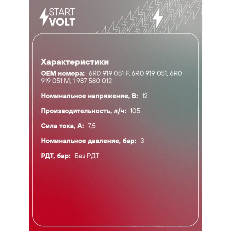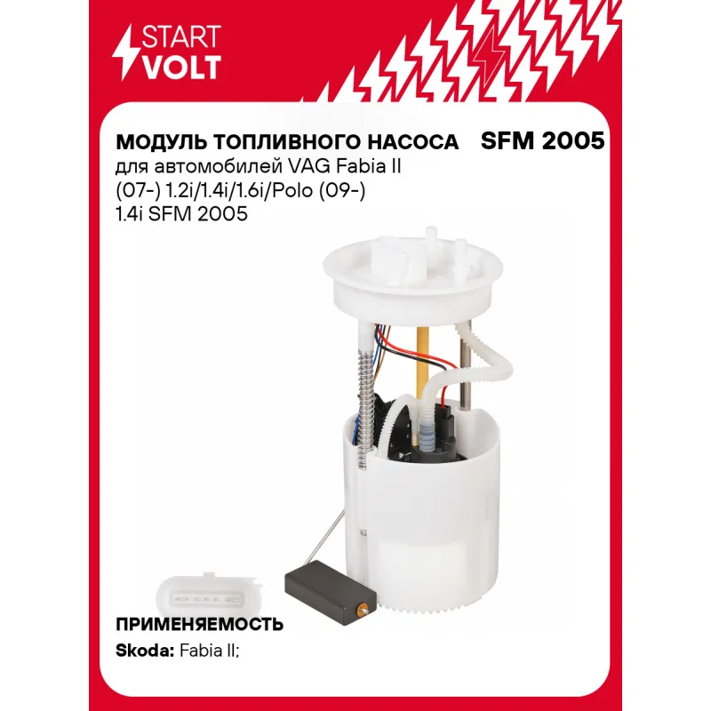 Модуль топливного насоса для автомобилей VAG Fabia II (07-) 1.2i/1.4i/1.6i/Polo (09-) 1.4i Характеристики: Артикул: SFM 2005 OEM номера: 6R0 919 051 F, 6R0 919 051, 6R0 919 051 M, 1 987 580 012 Номинальное напряжение, В: 12 Производительность, л/ч: 105 Сила тока, А: 7,5 Номинальное давление, бар: 3 РДТ, бар: без РДТ Количество на автомобиль: 1 Подходит для авто: Skoda Fabia II (07-) Для проверки применяемости отправьте VIN автомобиля через вкладку "Есть вопросы о товаре?" Комплектация: Модуль топливного насоса - 1 шт Паспорт изделия/гарантийный талон - 1 шт Гарантия: от 1 года.