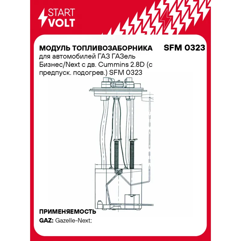 Модуль топливозаборника для автомобилей ГАЗ ГАЗель Бизнес/Next с дв. Cummins 2.8D (с предпуск. подогрев.) Характеристики: Артикул: SFM 0323 OEM номера: 3302.1139020 Количество на автомобиль: 1 Подходит для авто: ГАЗ Gazelle-Next (13-) Для проверки применяемости отправьте VIN автомобиля через вкладку "Есть вопросы о товаре?" Комплектация: Паспорт изделия/гарантийный талон - 1 шт Модуль топливозаборника - 1 шт Гарантия: от 1 года.