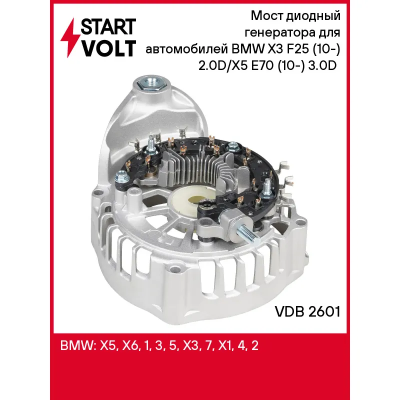 Мост диодный генератора для автомобилей BMW X3 F25 (10-) 2.0D/X5 E70 (10-) 3.0D (с крышкой) Характеристики: Артикул: VDB 2601 OEM номера: 595364, 599186, 599264 Номинальное напряжение, В: 14 Количество диодов: 12 Размер резьбы болта B+: М8 Сила тока диода, А: 50 Количество на автомобиль: 1 Комплектация: Паспорт изделия/гарантийный талон - 1 шт Мост диодный генератора в сборе с крышкой - 1 шт Гарантия: от 1 года.