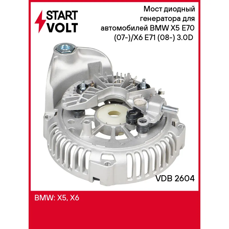 Мост диодный генератора для автомобилей BMW X5 Е70 (07-)/X6 Е71 (08-) 3.0D (с крышкой) Характеристики: Артикул: VDB 2604 OEM номера: 595729 Номинальное напряжение, В: 14 Количество диодов: 6 Размер резьбы болта B+: М8 Сила тока диода, А: 60 Количество на автомобиль: 1 Комплектация: Паспорт изделия/гарантийный талон - 1 шт Мос... Читать полностью →