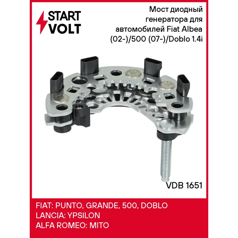 Мост диодный генератора для автомобилей Fiat Albea (02-)/500 (07-)/Doblo (01-) 1.4i Характеристики: Артикул: VDB 1651 OEM номера: 77362378, 9948412, 9948568, 9948573, 9948574, 9948614, 9949499, 9951186, 9951263, 9948668, 9948684, 9948688, 9949120, 9949153, 9947879, 63625002, 85552110, IXR638, IXR640 Номинальное напряжение, В: 14 Количество диодов: 6 Размер резьбы болта B+: M8 Сила тока диода, А: 35 Количество на автомобиль: 1 Длина болта B+: 40 Дополнительные диоды: Нет Количество клемм к статору: 3 Комплектация: Паспорт изделия/гарантийный талон - 1 шт Мост диодный генератора - 1 шт Гарантия: от 1 года.