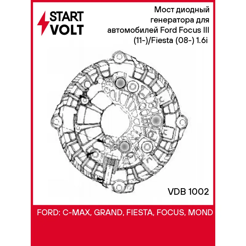 Мост диодный генератора для автомобилей Ford Focus III (11-)/Fiesta (08-) 1.6i (с крышкой) Характеристики: Артикул: VDB 1002 OEM номера: 2603196, 595321, MER5229 Номинальное напряжение, В: 14 Количество диодов: 6 Размер резьбы болта B+: М8 Сила тока диода, А: 50 Количество на автомобиль: 1 Комплектация: Мост диодный генератор... Читать полностью →