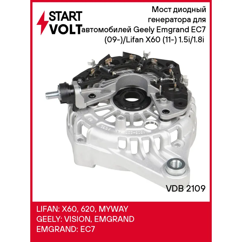 Мост диодный генератора для автомобилей Geely Emgrand EC7 (09-)/Lifan X60 (11-) 1.5i/1.8i (с крышкой) Характеристики: Артикул: VDB 2109 OEM номера: LFB479Q-3701100A Номинальное напряжение, В: 14 Количество диодов: 6 Размер резьбы болта B+: М8 Сила тока диода, А: 50 Количество на автомобиль: 1 Комплектация: Мост диодный генератора в сборе с крышкой - 1 шт Паспорт изделия/гарантийный талон - 1 шт Гарантия: от 1 года.