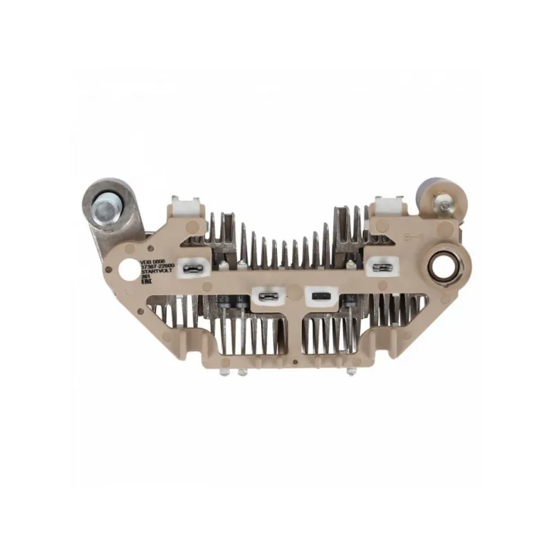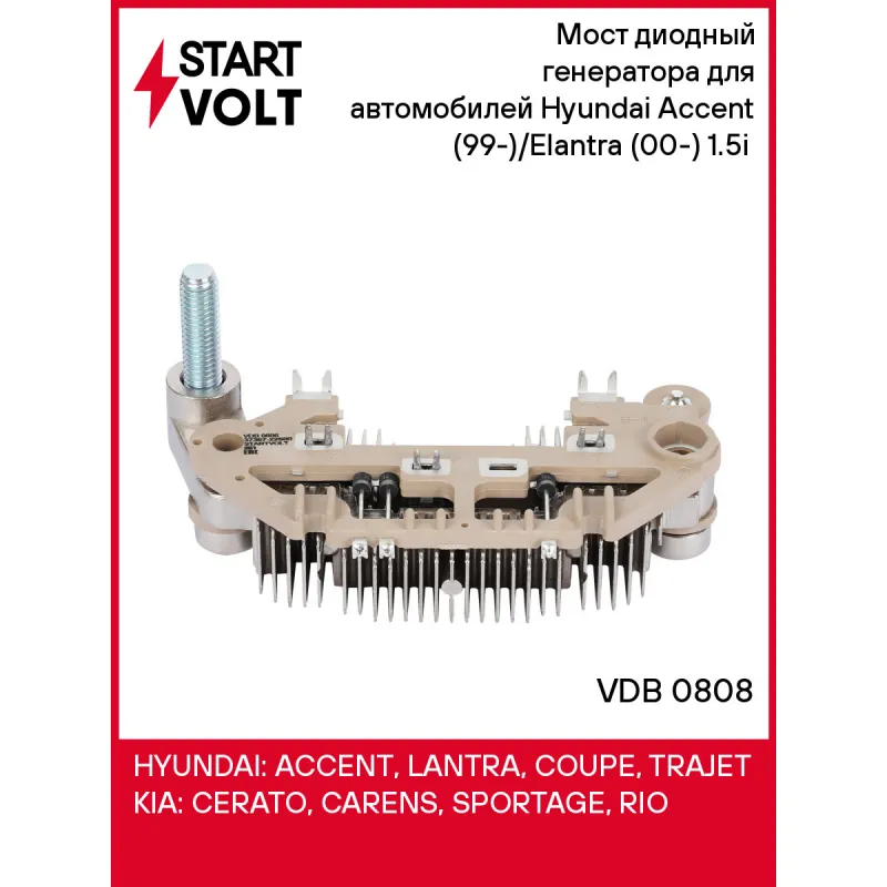 Мост диодный генератора для автомобилей Hyundai Accent (99-)/Elantra (00-) 1.5i (тип Mando) Характеристики: Артикул: VDB 0808 OEM номера: 37367-22600, 37367-23600, IYR9028 Номинальное напряжение, В: 14 Количество диодов: 6 Размер резьбы болта B+: М8 Сила тока диода, А: 35 Количество на автомобиль: 1 Длина болта B+: 25 Дополнительные диоды: Да Количество клемм к статору: 3 Комплектация: Паспорт изделия/гарантийный талон - 1 шт Мост диодный генератора - 1 шт Гарантия: от 1 года.