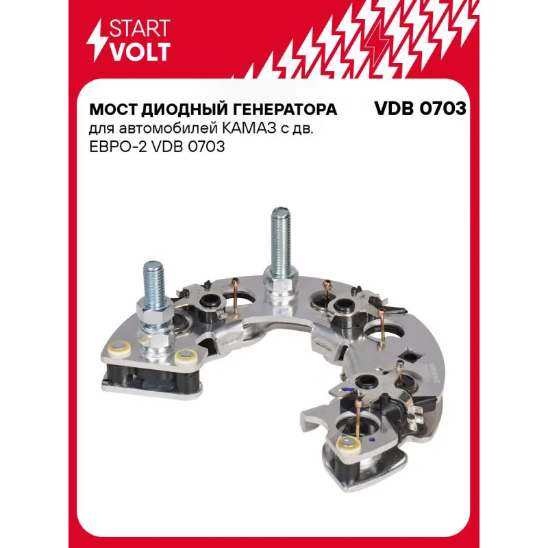 Мост диодный генератора для автомобилей КАМАЗ с дв. ЕВРО-2 Характеристики: Артикул: VDB 0703 OEM номера: 4542.3771.320 Номинальное напряжение, В: 28 Количество диодов: 6 Размер резьбы болта B+: М8 Количество на автомобиль: 1 Комплектация: Мост диодный генератора - 1 шт Паспорт изделия/гарантийный талон - 1 шт Гарантия: от 1 года.