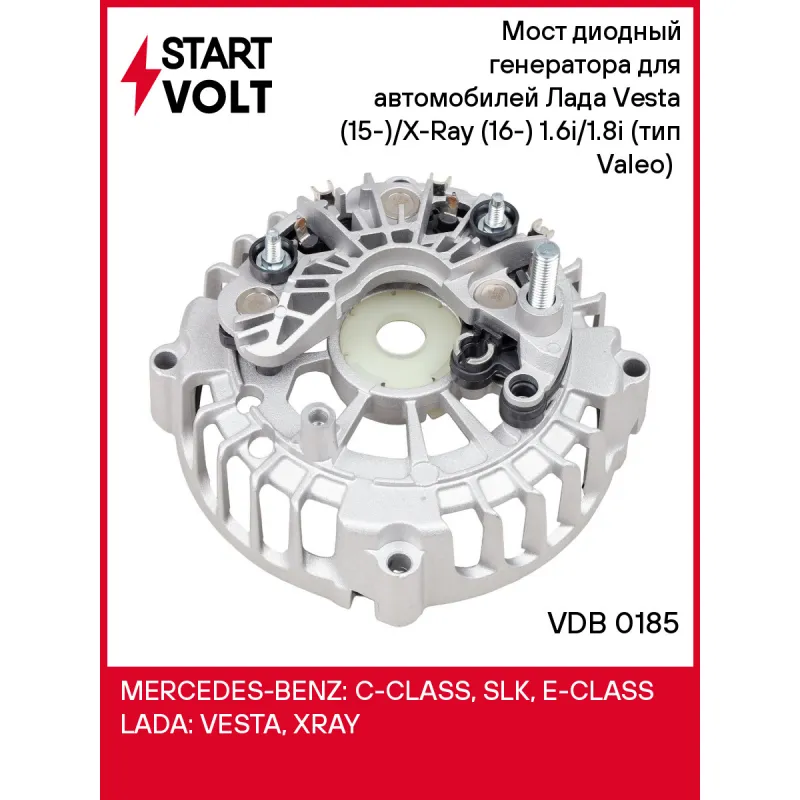 Мост диодный генератора для автомобилей Лада Vesta (15-)/X-Ray (16-) 1.6i/1.8i (тип Valeo) (с крышкой) Характеристики: Артикул: VDB 0185 OEM номера: 599473, 595300 Номинальное напряжение, В: 14 Количество диодов: 6 Размер резьбы болта B+: М8 Сила тока диода, А: 50 Количество на автомобиль: 1 Длина болта B+: 15.5 Количество клемм... Читать полностью →