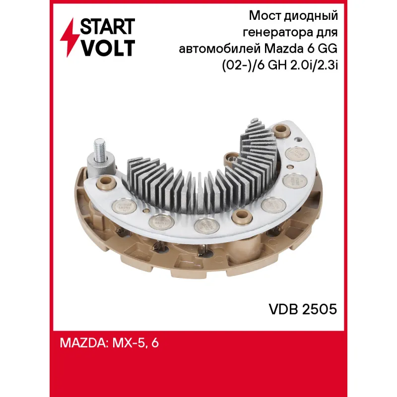 Мост диодный генератора для автомобилей Mazda 6 GG (02-)/6 GH (07-) 2.0i/2.3i Характеристики: Артикул: VDB 2505 OEM номера: L3P918W60, 93475B04899401H, A860X93471, A860X93471AM, 231243TA1A, 3162165J20, IMR12204 Номинальное напряжение, В: 14 Количество диодов: 12 Размер резьбы болта B+: М6 Сила тока диода, А: 50 Количество на автомобиль: 1 Длина болта B+: 10.5 Дополнительные диоды: Нет Количество клемм к статору: 6 Комплектация: Паспорт изделия/гарантийный талон - 1 шт Мост диодный генератора - 1 шт Гарантия: от 1 года.