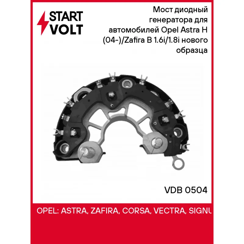 Мост диодный генератора для автомобилей Opel Astra H (04-)/Zafira B (05-) 1.6i/1.8i нового образца Характеристики: Артикул: VDB 0504 OEM номера: 77362606, 6205504, 6001548085, 7701047246, F00M123203, F00M123231, F00M123237, F00M123272, F00M123318, IBR2237 Номинальное напряжение, В: 14 Количество диодов: 6 Размер резьбы болта B+: М8 Сила тока диода, А: 50 Количество на автомобиль: 1 Дополнительные диоды: Нет Количество клемм к статору: 6 Комплектация: Мост диодный генератора - 1 шт Паспорт изделия/гарантийный талон - 1 шт Гарантия: от 1 года.