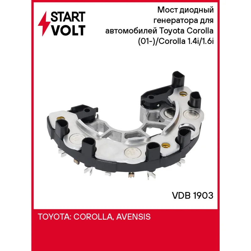 Мост диодный генератора для автомобилей Toyota Corolla (01-)/Corolla (07-) 1.4i/1.6i Характеристики: Артикул: VDB 1903 OEM номера: 273570L030, F00M123238, F00M123323, IBR238 Номинальное напряжение, В: 14 Количество диодов: 6 Размер резьбы болта B+: М8 Сила тока диода, А: 50 Количество на автомобиль: 1 Длина болта B+: 16.9 Дополнительные диоды: Нет Количество клемм к статору: 6 Комплектация: Паспорт изделия/гарантийный талон - 1 шт Мост диодный генератора - 1 шт Гарантия: от 1 года.