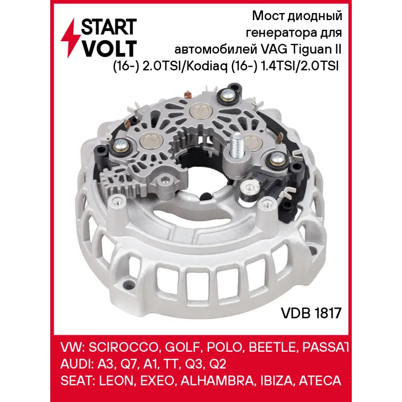 Мост диодный генератора для автомобилей VAG Tiguan II (16-) 2.0TSI/Kodiaq (16-) 1.4TSI/2.0TSI (с крышкой) Характеристики: Артикул: VDB 1817 OEM номера: 03G903359J, F000BL2114 Номинальное напряжение, В: 14 Количество диодов: 6 Сила тока диода, А: 60 Количество на автомобиль: 1 Комплектация: Мост диодный генератора в сборе с крышкой - 1 шт Паспорт изделия/гарантийный талон - 1 шт Гарантия: от 1 года.