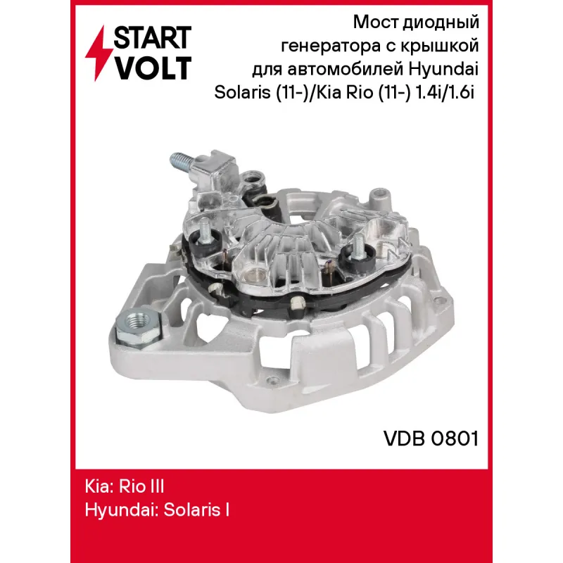 Мост диодный генератора с крышкой для автомобилей Hyundai Solaris (11-)/Kia Rio (11-) 1.4i/1.6i (с крышкой) Характеристики: Артикул: VDB 0801 OEM номера: 37360-2B100, 332022 Сила тока диода, А: 35 Количество на автомобиль: 1 Длина болта B+: 13.5 Количество клемм к статору: 3 Номинальное напряжение, В: 14 Количество диодов: 6 Размер резьбы болта B+: М8 Подходит для авто: Kia Rio III (11-) Hyundai Solaris I (10-) Для проверки применяемости отправьте VIN автомобиля через вкладку "Есть вопросы о товаре?" Комплектация: Мост диодный генератора в сборе с крышкой - 1 шт Паспорт изделия/гарантийный талон - 1 шт Гарантия: от 1 года.